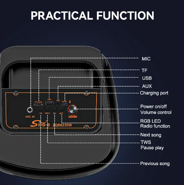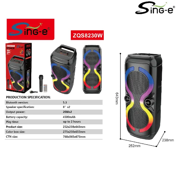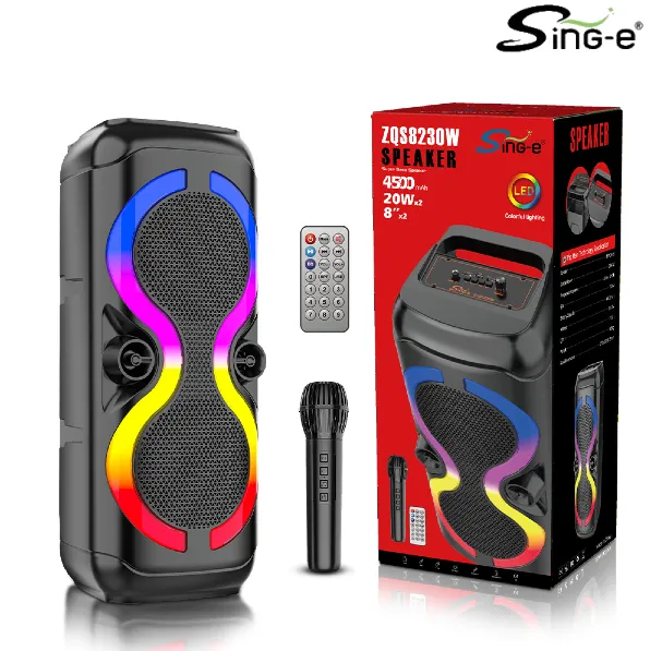 Parlante 8″x2 Bluetooth Con Micrófono Y Control / Radio FM / MicroSD / USB / AUX 3.5mm / 20Wx2 / 4500mah / Sing-e ZQS-8230w
